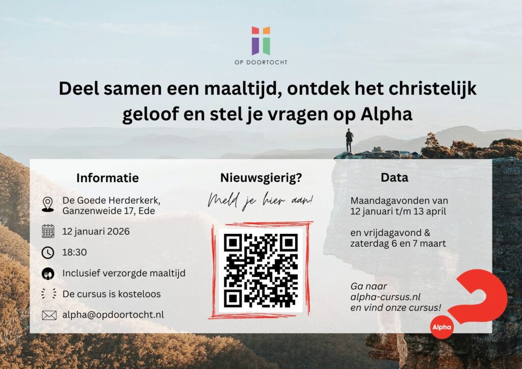 Meld je aan voor de infoavond, of stel je vragen via alpha@opdoortocht.nl. Kom je ook?
